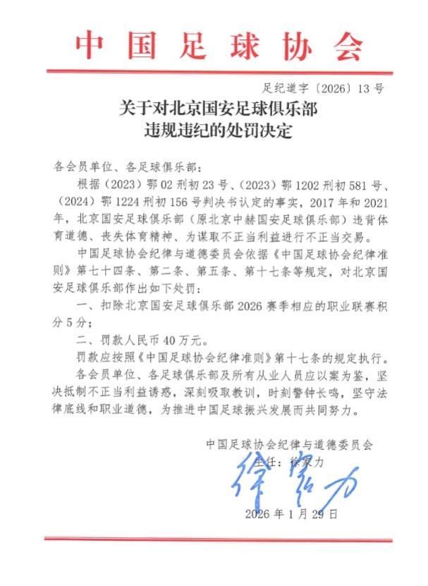 北京时间1月29日,中国足协正式公布了“假赌黑”专项整治行动受处罚的俱乐部名单。新赛季中超共计有9支队将被罚从负分起步,其中就包括申花、海港、国安、泰山等争冠队。而在足协开出重磅罚单后,不少球队也第一时间回应了处罚。而北京国安官方回应耐人寻味。国安官微愤怒写道:“人在做,天在看,头顶三尺有神明!”对于国安的强硬回应,不少北京球迷点赞道:“我相信我们支持多年的...